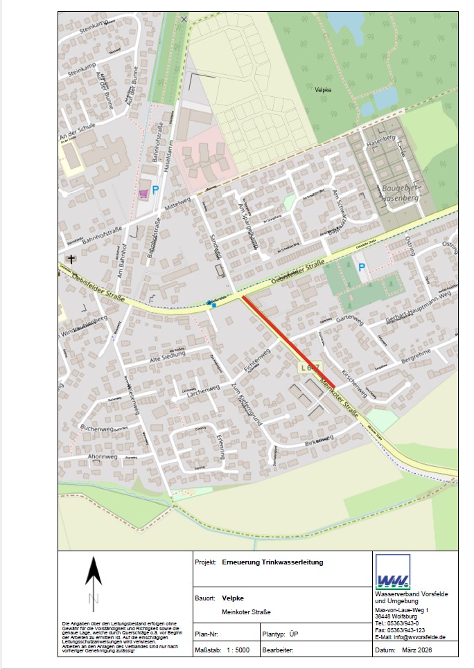 Der Wasserverband Vorsfelde erneuert ab KW13/2026 die sanierungsbedürftige Trinkwasserleitung zur Sicherstellung der Trinkwasserversorgung in der Versorgungszone im Bereich der „Meinkoter Straße“ in Velpke.